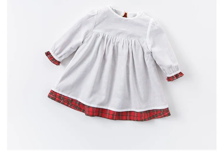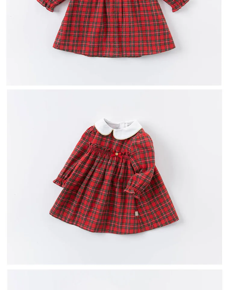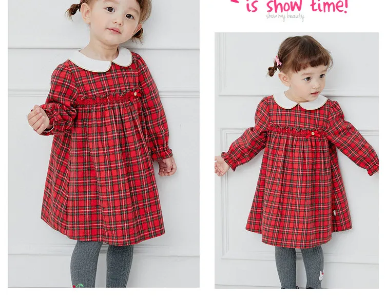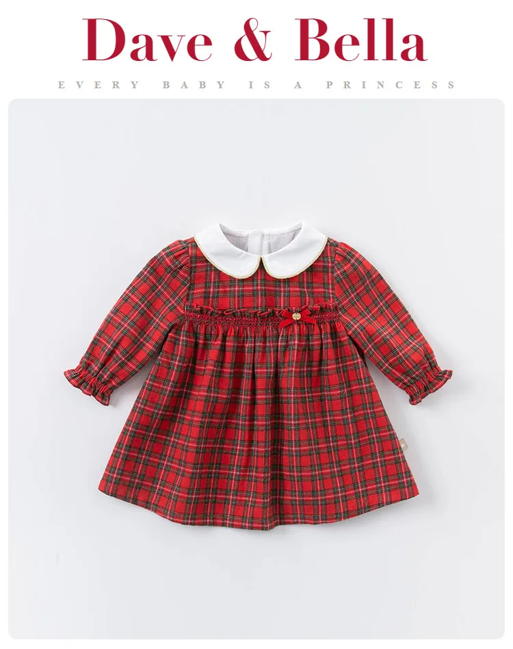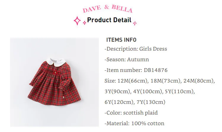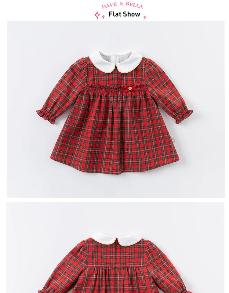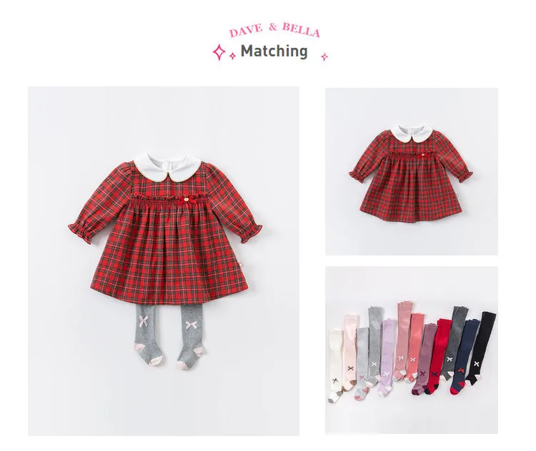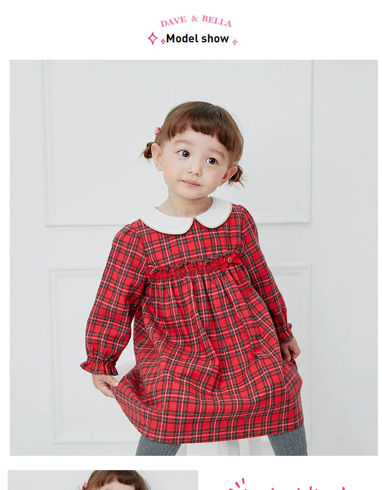 DB14876 dave bella autumn baby girl's cute bow ruched plaid print dress children fashion party dress kids infant lolita clothes